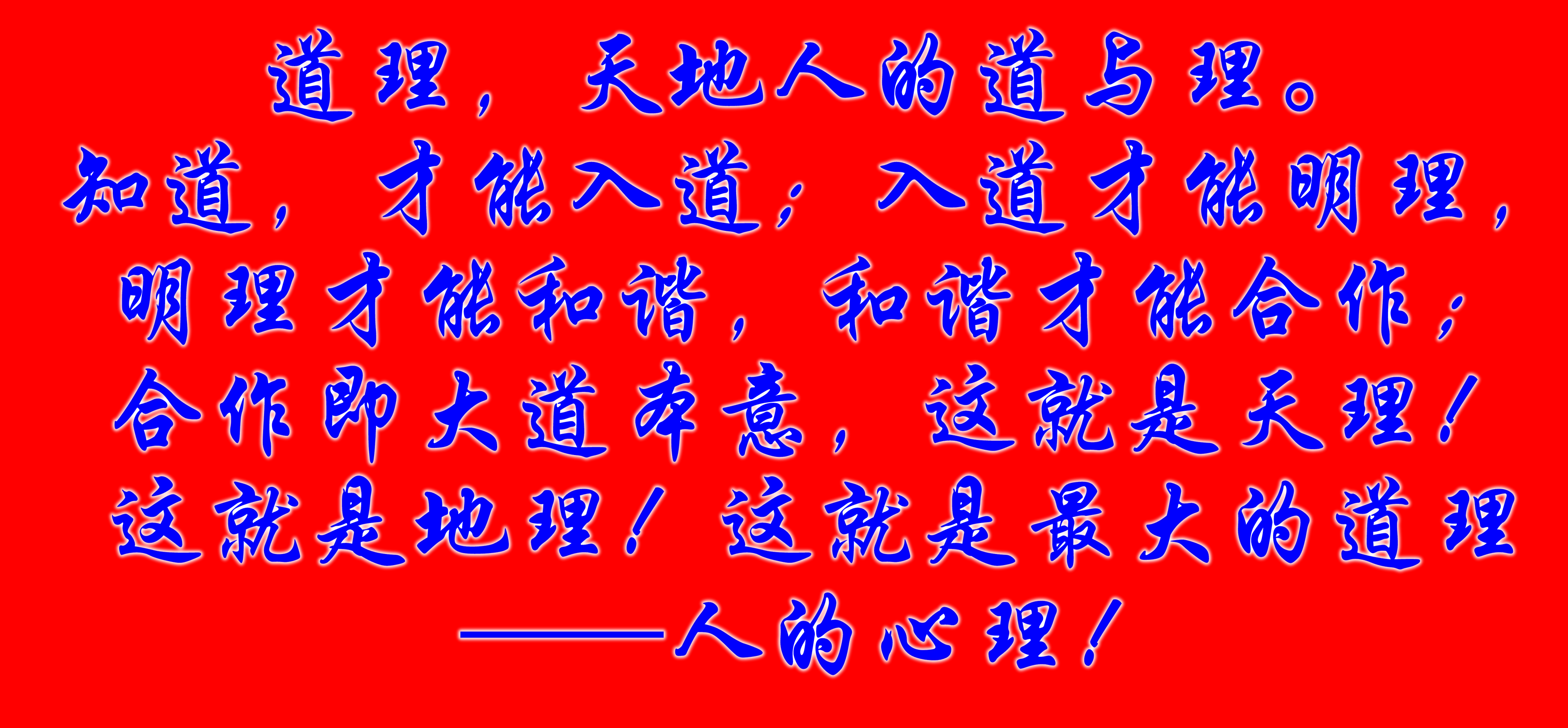道理,天地人的道與理。知道,才能入道;入道才能明理,明理才能和諧,和諧才能合作;合作即大道本意,這就是天理!這就是地理!這就是最大的道理——人的心理!