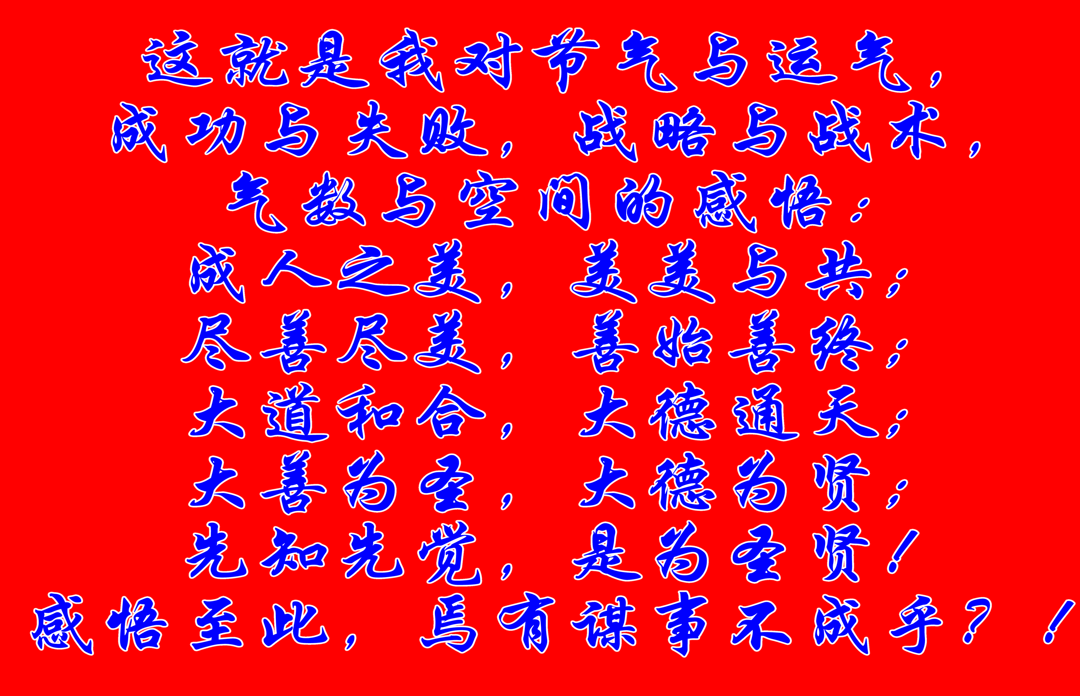 這就是我對(duì)節(jié)氣與運(yùn)氣,成功與失敗,戰(zhàn)略與戰(zhàn)術(shù),氣數(shù)與空間的感悟:成人之美,美美與共;盡善盡美,善始善終;大道和合,大德通天;大善為圣,大德為賢;先知先覺,是為圣賢!感悟至此,焉有謀事不成乎?!
