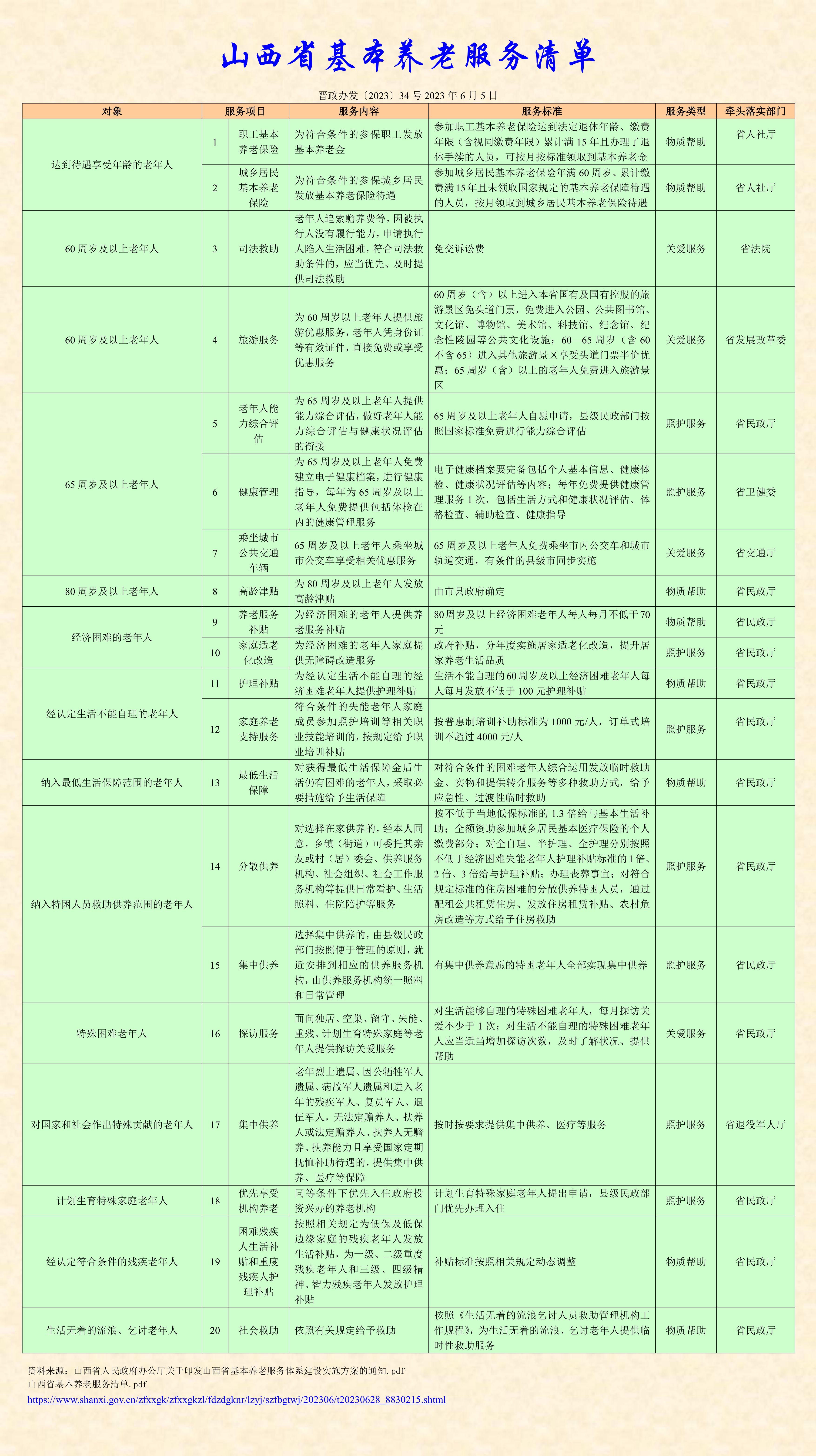 15、 集中供養(yǎng) 選擇集中供養(yǎng)的,由縣級(jí)民政部門按照便于管理的原則,就近安排到相應(yīng)的供養(yǎng)服務(wù)機(jī)構(gòu),由供養(yǎng)服務(wù)機(jī)構(gòu)統(tǒng)一照料和日常管理 有集中供養(yǎng)意愿的特困老年人全部實(shí)現(xiàn)集中供養(yǎng) 照護(hù)服務(wù) 省民政廳