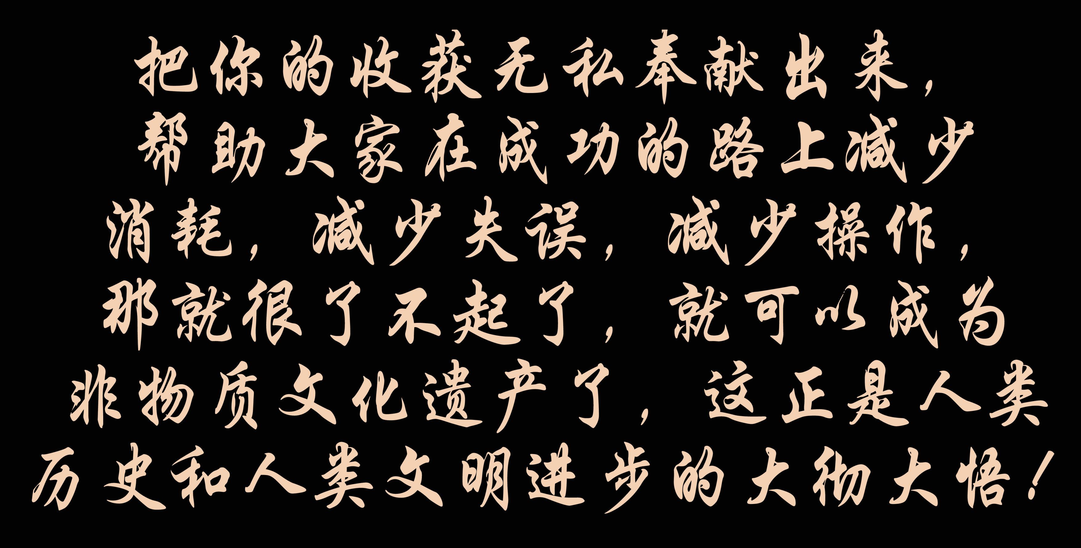 把你的收獲無私奉獻(xiàn)出來,幫助大家在成功的路上減少消耗,減少失誤,減少操作,那就很了不起了,就可以成為非物質(zhì)文化遺產(chǎn)了,這正是人類歷史和人類文明進(jìn)步的大徹大悟!