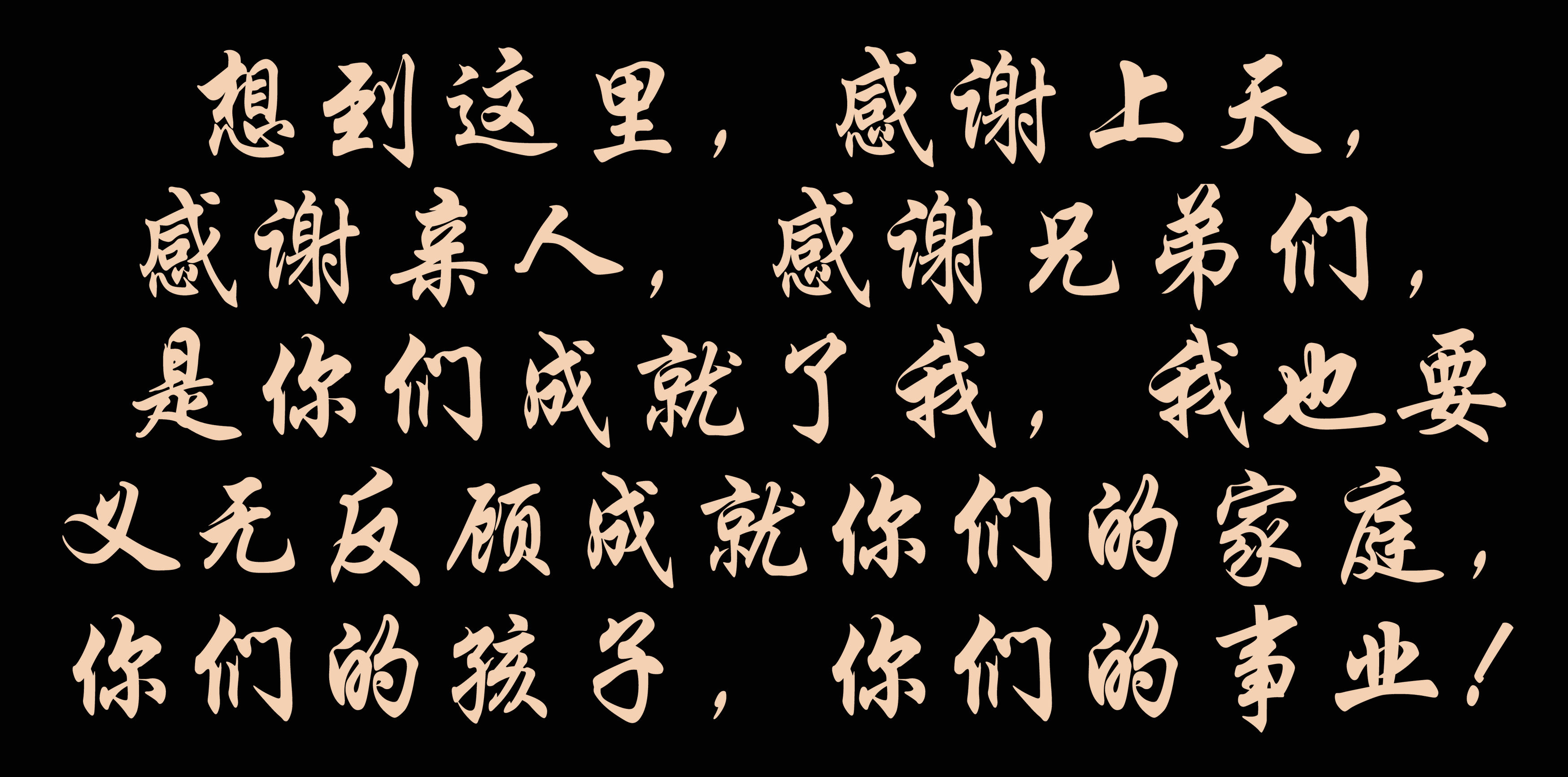 想到這里,感謝上天,感謝親人,感謝兄弟們,是你們成就了我,我也要義無(wú)反顧成就你們的家庭,你們的孩子,你們的事業(yè)!