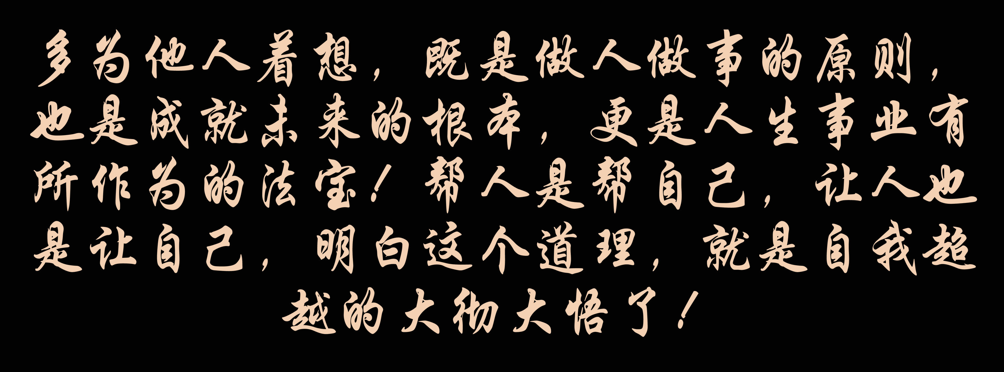 多為他人著想,既是做人做事的原則,也是成就未來的根本,更是人生事業(yè)有所作為的法寶!幫人是幫自己,讓人也是讓自己,明白這個(gè)道理,就是自我超越的大徹大悟了!