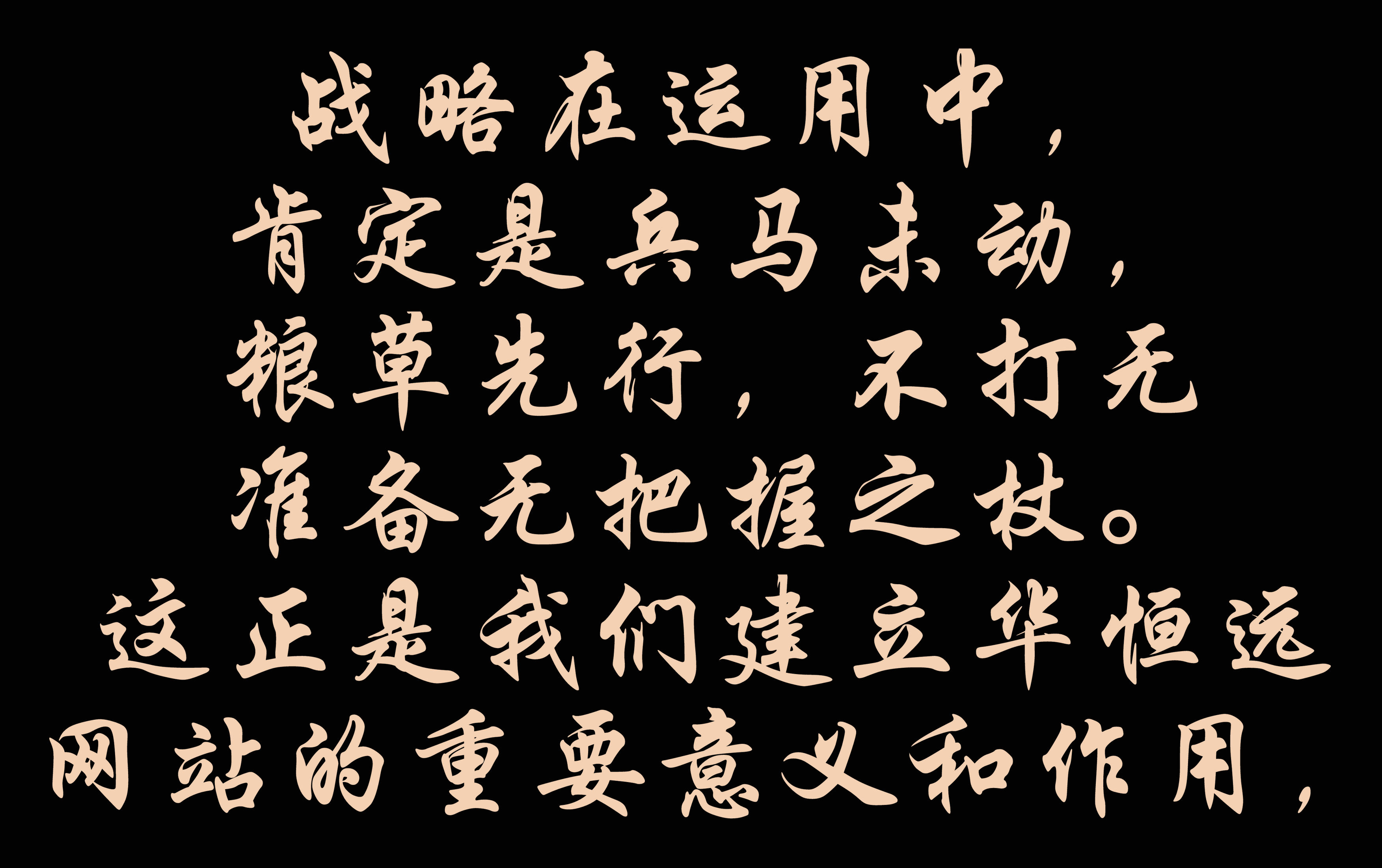 戰(zhàn)略在運(yùn)用中,肯定是兵馬未動(dòng),糧草先行,不打無準(zhǔn)備無把握之杖。這正是我們建立華恒遠(yuǎn)網(wǎng)站的重要意義和作用,讓更多層面更多層次的瀏覽者,知道華恒遠(yuǎn),喜歡華恒遠(yuǎn),就已經(jīng)達(dá)到了戰(zhàn)略發(fā)展的第一步,那么第二步就好邁開了!三年時(shí)間,人們自然而然接受華恒遠(yuǎn),你們可是要出大名的,那個(gè)時(shí)候,才會(huì)真正懂得什么是戰(zhàn)略,才會(huì)自覺自愿加入到開發(fā)網(wǎng)站的行動(dòng)之中,那就到了網(wǎng)站改版的必須空間了!