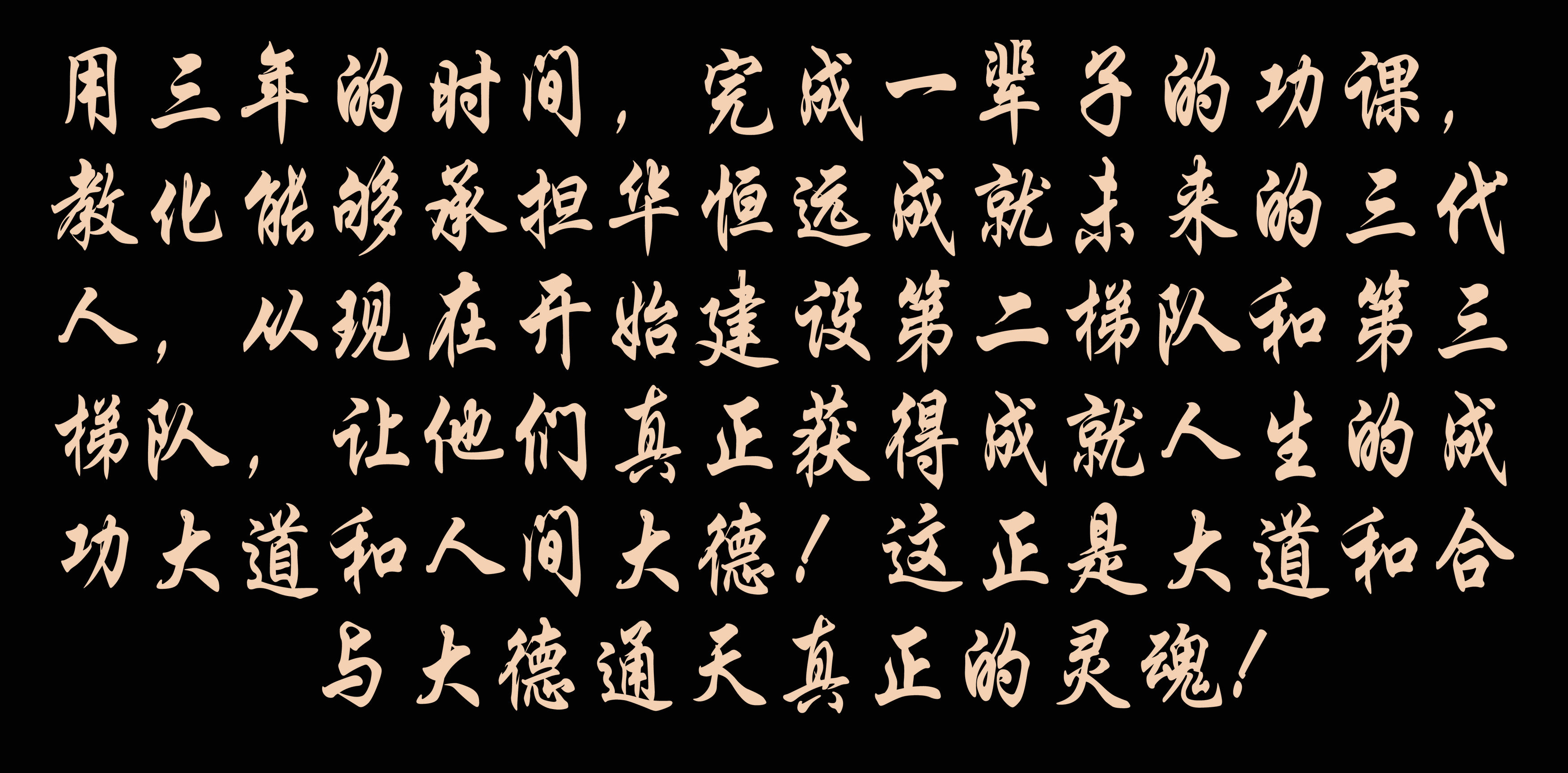 我計(jì)劃用三年的時(shí)間,完成一輩子的功課,教化能夠承擔(dān)華恒遠(yuǎn)成就未來(lái)的三代人,從現(xiàn)在開(kāi)始建設(shè)第二梯隊(duì)和第三梯隊(duì),讓他們真正獲得成就人生的成功大道和人間大德!這正是大道和合與大德通天真正的靈魂!
