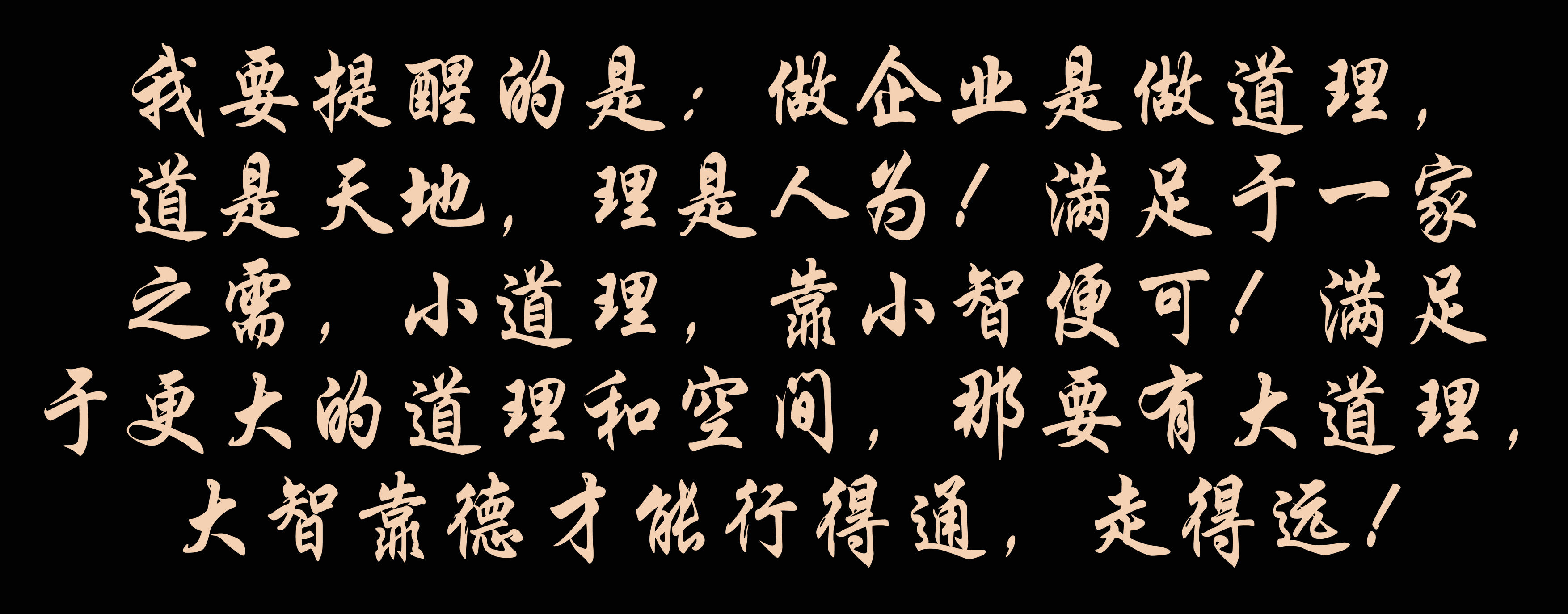 我要提醒的是:做企業(yè)是做道理,道是天地,理是人為!滿足于一家之需,小道理,靠小智便可!滿足于更大的道理和空間,那要有大道理,大智靠德才能行得通,走得遠(yuǎn)!
