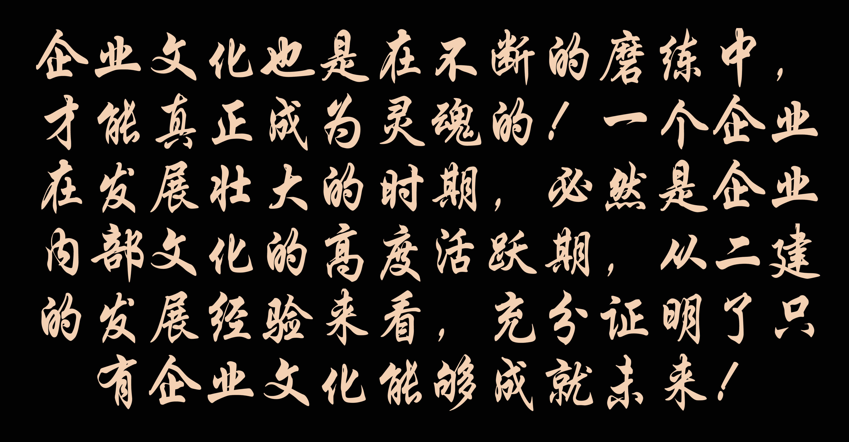企業(yè)文化也是在不斷的磨練中,才能真正成為靈魂的!一個企業(yè)在發(fā)展壯大的時期,必然是企業(yè)內部文化的高度活躍期,從二建的發(fā)展經(jīng)驗來看,充分證明了只有企業(yè)文化能夠成就未來!