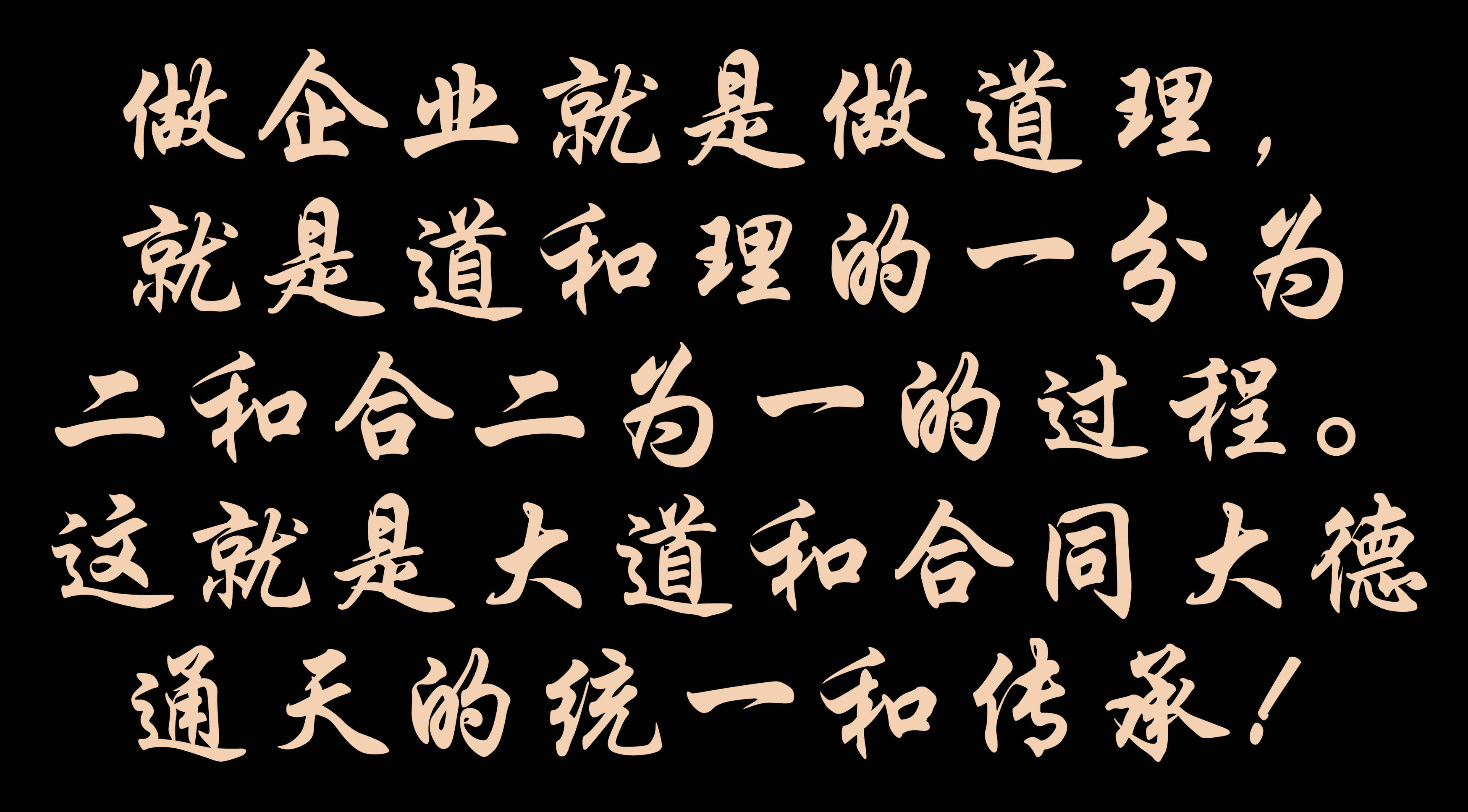 大自然一切事物,都是一個(gè)非常簡(jiǎn)單的和與不和,合與不合的利益關(guān)系,做企業(yè)就是做道理,就是道和理的一分為二和合二為一的過(guò)程。這就是大道和合同大德通天的統(tǒng)一和傳承!