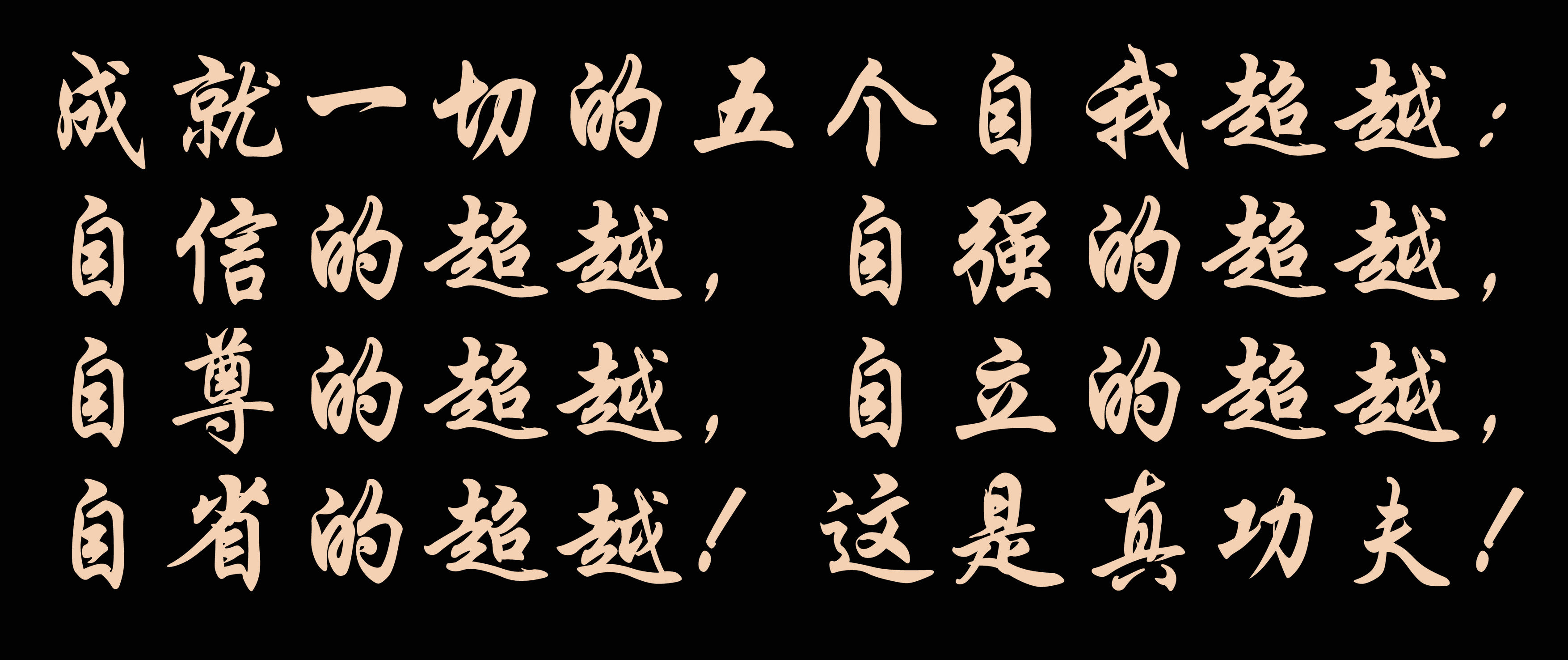 真功夫,硬功夫,在修煉,在修心,在“五不怕”,在“五不粘”!真正做到這些,就有了成就一切的五個(gè)自我超越:自信的超越,自強(qiáng)的超越,自尊的超越,自立的超越,自省的超越!這是真功夫!