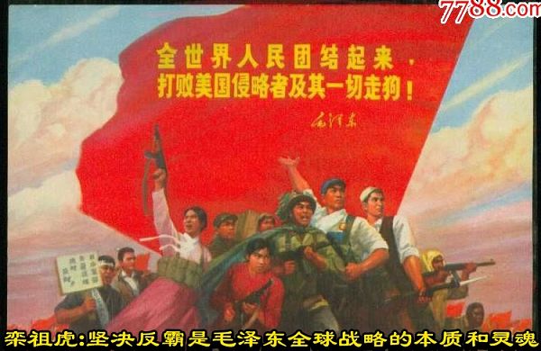 “社會(huì)主義陣營各國人民要聯(lián)合起來,亞洲、非洲、拉丁美洲各國人民要聯(lián)合起來,全世界各大洲的人民要聯(lián)合起來,所有愛好和平的國家要聯(lián)合起來,所有受到美國侵略、控制、干涉和欺負(fù)的國家要聯(lián)合起來,結(jié)成最廣泛的統(tǒng)一戰(zhàn)線,反對美帝國主義的侵略政策和戰(zhàn)爭政策,保衛(wèi)世界和平?!薄懊赖蹏髁x到處橫行霸道,把它自己放在同全世界人民為敵的地位,使它自己越來越陷于孤立。美帝國主義手里的原子彈、氫彈,是嚇不倒一切不愿意做奴隸的人們的。全世界人民反對美國侵略者的怒潮是不可阻擋的。全世界人民反對美帝國主義及其走狗的斗爭一定會(huì)取得更加偉大的勝利?!?毛澤東《中國人民堅(jiān)決支持巴拿馬人民的愛國正義斗爭》,一九六四年一月十二日)