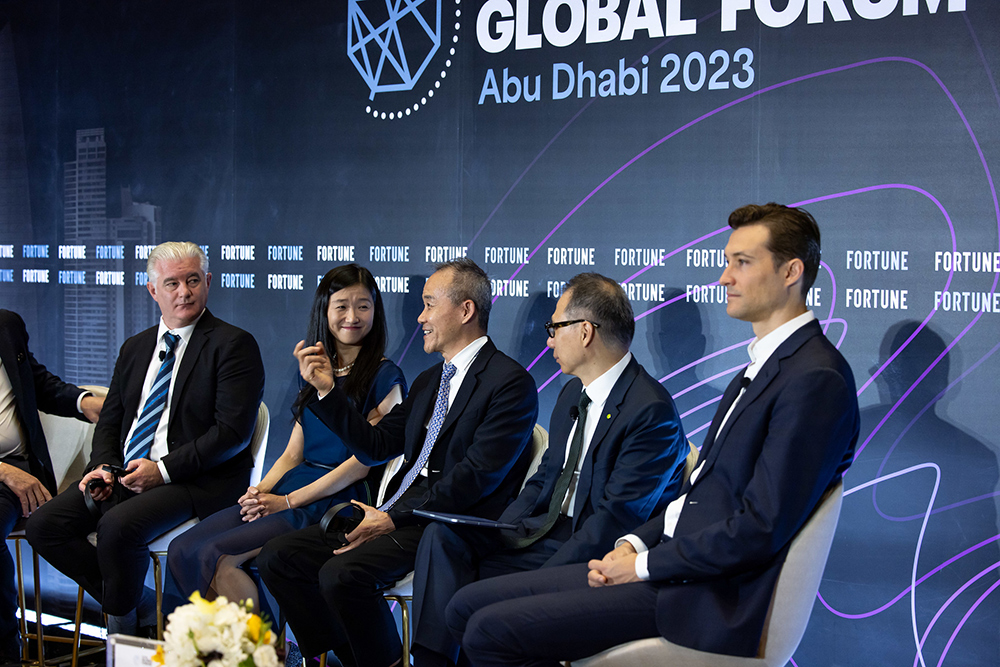 《財富》全球論壇“展望中國經(jīng)濟”圓桌上,五位發(fā)言嘉賓分別是(從左至右):扎耶德大學政治學副教授Jonathan Fulton;美國外交關(guān)系委員會中國問題研究員劉宗媛;萬科企業(yè)股份有限公司董事會名譽主席王石;德勤中國首席執(zhí)行官曾順福;和玉資本(MSA Capital)管理合伙人Ben Harburg