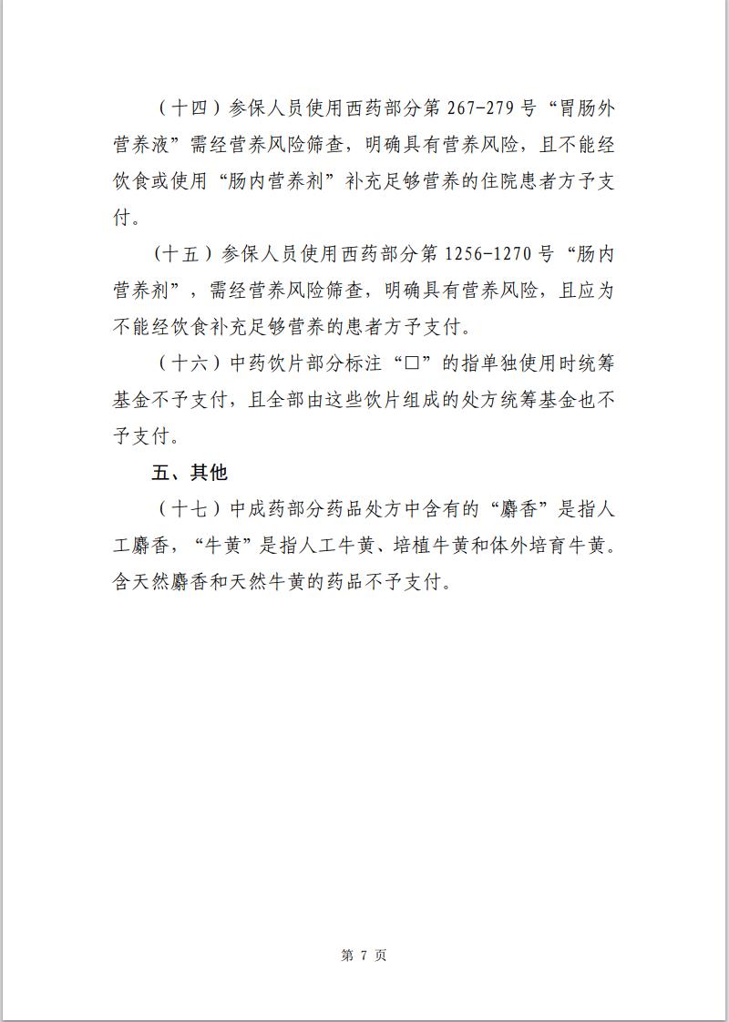 (十四)參保人員使用西藥部分第267-279號“胃腸外營養(yǎng)液”需經(jīng)營養(yǎng)風險篩查,明確具有營養(yǎng)風險,且不能經(jīng)飲食或使用“腸內(nèi)營養(yǎng)劑”補充足夠營養(yǎng)的住院患者方予支付。