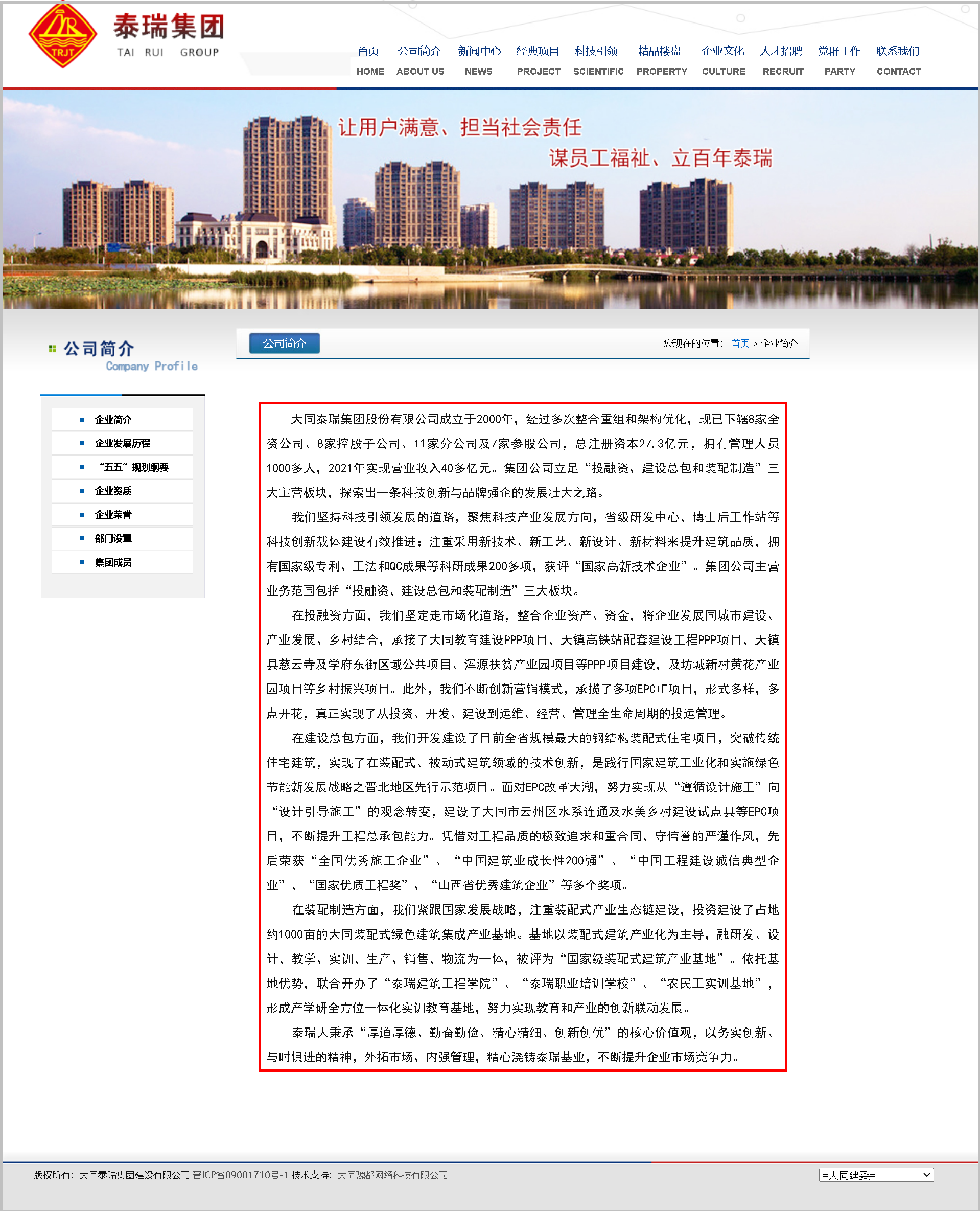 大同泰瑞集團(tuán)建設(shè)有限公司,經(jīng)過二十三年的拼搏奮斗,終于如愿以償進(jìn)入了全國建筑行業(yè)高端行列,成為特級資質(zhì)的大企業(yè)、大集團(tuán)、大公司!