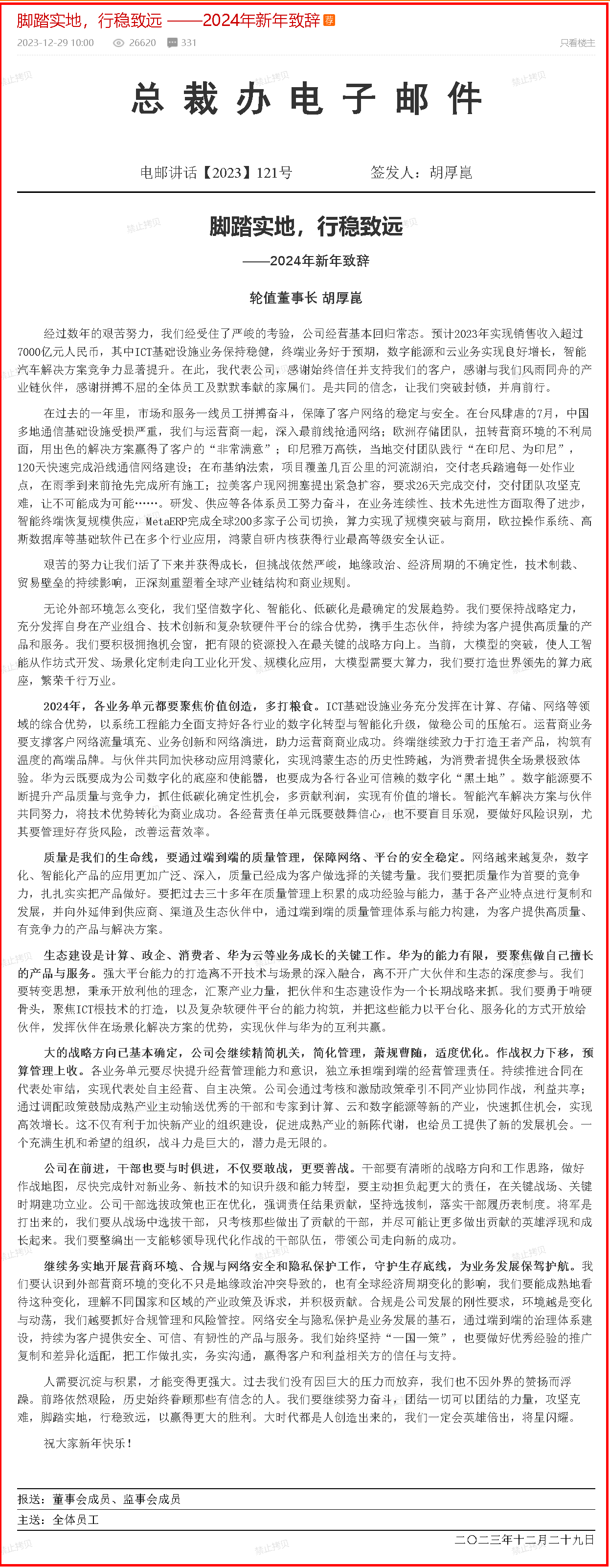 經(jīng)過(guò)數(shù)年的艱苦努力,我們經(jīng)受住了嚴(yán)峻的考驗(yàn),公司經(jīng)營(yíng)基本回歸常態(tài)。預(yù)計(jì)2023年實(shí)現(xiàn)銷售收入超過(guò)7000億元人民幣,其中ICT基礎(chǔ)設(shè)施業(yè)務(wù)保持穩(wěn)健,終端業(yè)務(wù)好于預(yù)期,數(shù)字能源和云業(yè)務(wù)實(shí)現(xiàn)良好增長(zhǎng),智能汽車解決方案競(jìng)爭(zhēng)力顯著提升。在此,我代表公司,感謝始終信任并支持我們的客戶,感謝與我們風(fēng)雨同舟的產(chǎn)業(yè)鏈伙伴,感謝拼搏不屈的全體員工及默默奉獻(xiàn)的家屬們。是共同的信念,讓我們突破封鎖,并肩前行。