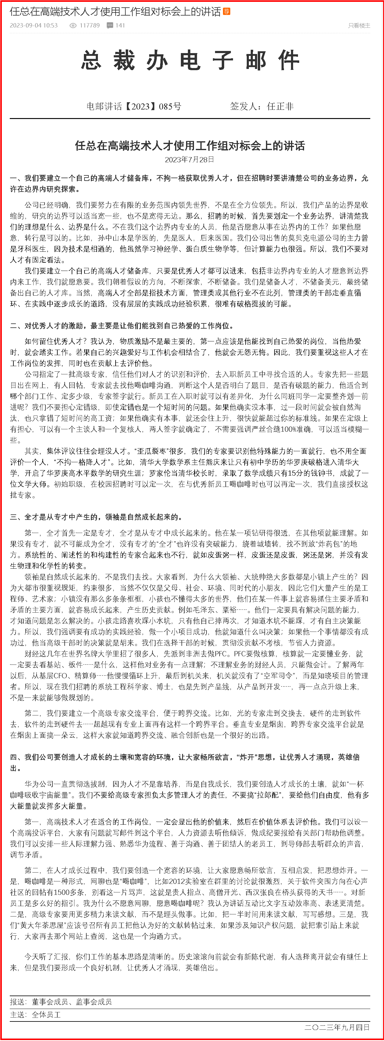 公司在前進(jìn),干部也要與時(shí)俱進(jìn),不僅要敢戰(zhàn),更要善戰(zhàn)。干部要有清晰的戰(zhàn)略方向和工作思路,做好作戰(zhàn)地圖,盡快完成針對(duì)新業(yè)務(wù)、新技術(shù)的知識(shí)升級(jí)和能力轉(zhuǎn)型,要主動(dòng)擔(dān)負(fù)起更大的責(zé)任,在關(guān)鍵戰(zhàn)場(chǎng)、關(guān)鍵時(shí)期建功立業(yè)。公司干部選拔政策也正在優(yōu)化,強(qiáng)調(diào)責(zé)任結(jié)果貢獻(xiàn),堅(jiān)持選拔制,落實(shí)干部履歷表制度。將軍是打出來(lái)的,我們要從戰(zhàn)場(chǎng)中選拔干部,只考核那些做出了貢獻(xiàn)的干部,并盡可能讓更多做出貢獻(xiàn)的英雄浮現(xiàn)和成長(zhǎng)起來(lái)。我們要整編出一支能夠領(lǐng)導(dǎo)現(xiàn)代化作戰(zhàn)的干部隊(duì)伍,帶領(lǐng)公司走向新的成功。