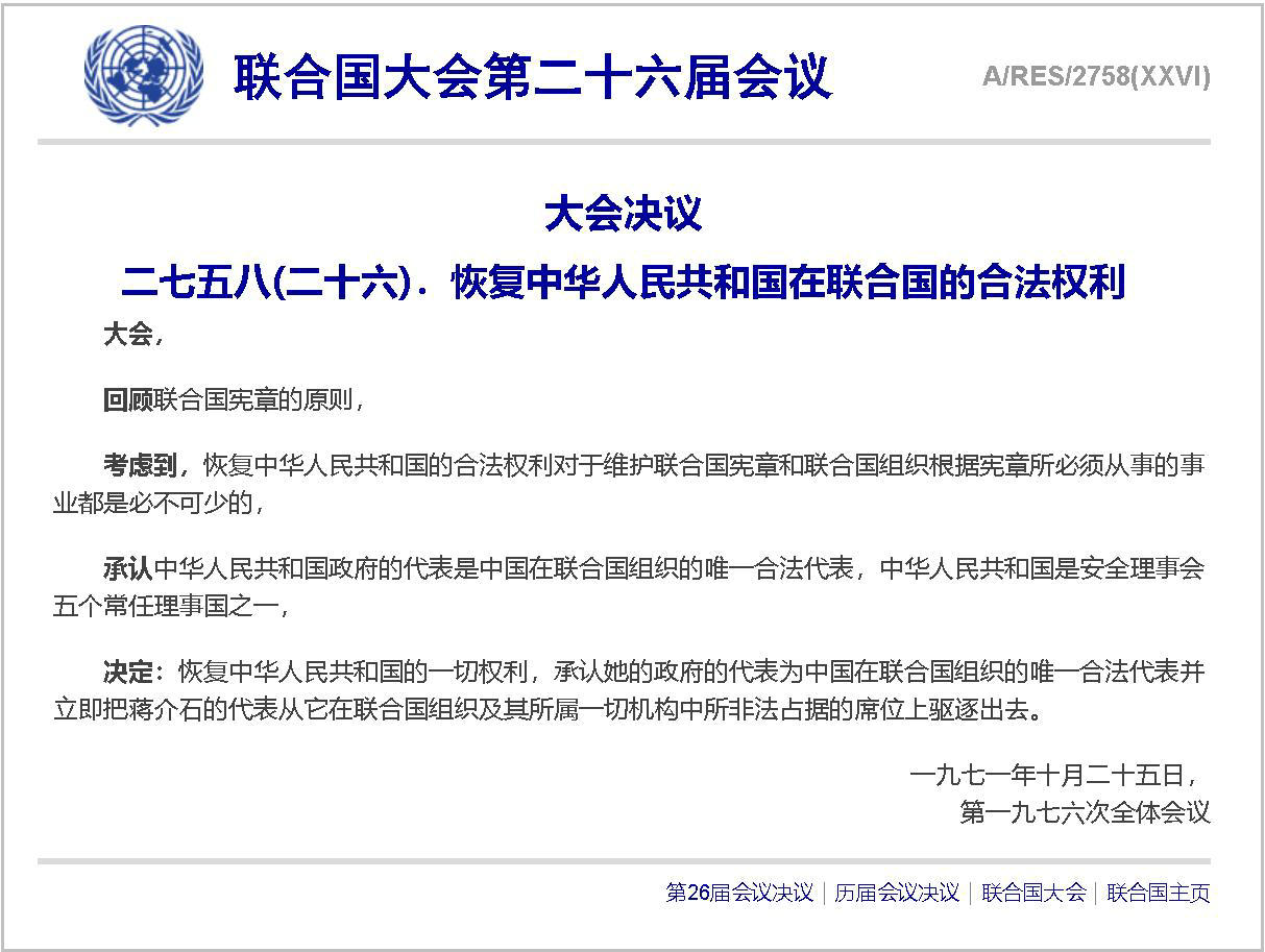 1971年召開的第二十六屆聯(lián)合國大會,是伸張正義的一屆大會。自10月18日起,大會就中國席位問題展開激烈的辯論。10月25日,大會就三個有關(guān)中國席位的提案進行表決。