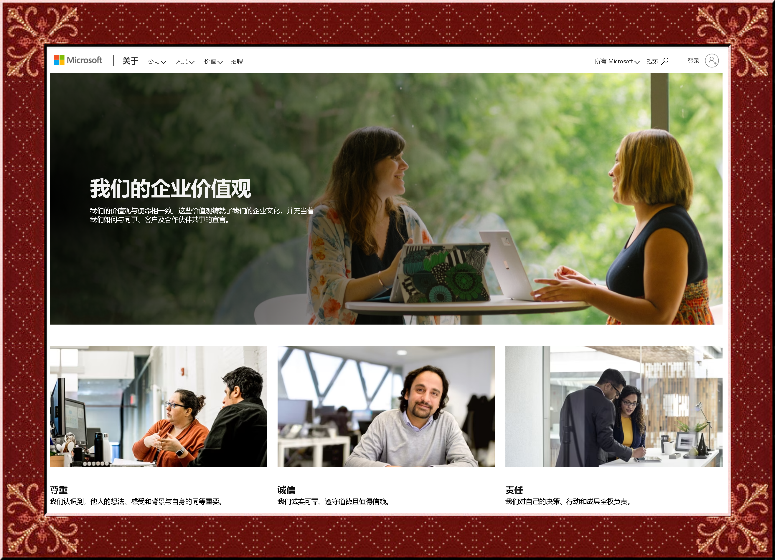 祝福偉大的微軟:我們的價值觀與使命相一致,這些價值觀鑄就了我們的企業(yè)文化,并充當著我們?nèi)绾闻c同事、客戶及合作伙伴共事的宣言!
