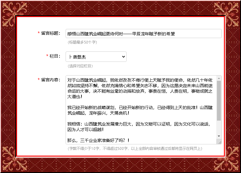 對于山西建筑業(yè)崛起,我依然孜孜不倦行使上天賦予我的使命,依然幾十年依然如故堅持不懈,依然充滿信心和希望矢志不移,因為這是決定未來山西前途命運的大事,決不能有絲毫的動搖和放棄,事貴在恒,人貴在明,事物成就之大道也!