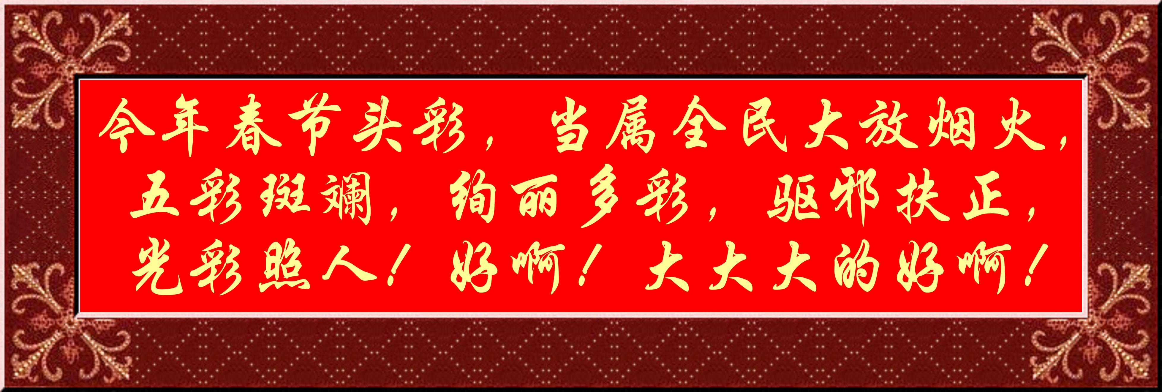 今年春節(jié)頭彩,當(dāng)屬全民大放煙火,五彩斑斕,絢麗多彩,驅(qū)邪扶正,光彩照人!好?。。〈蟠蟠蟮暮冒。。?!