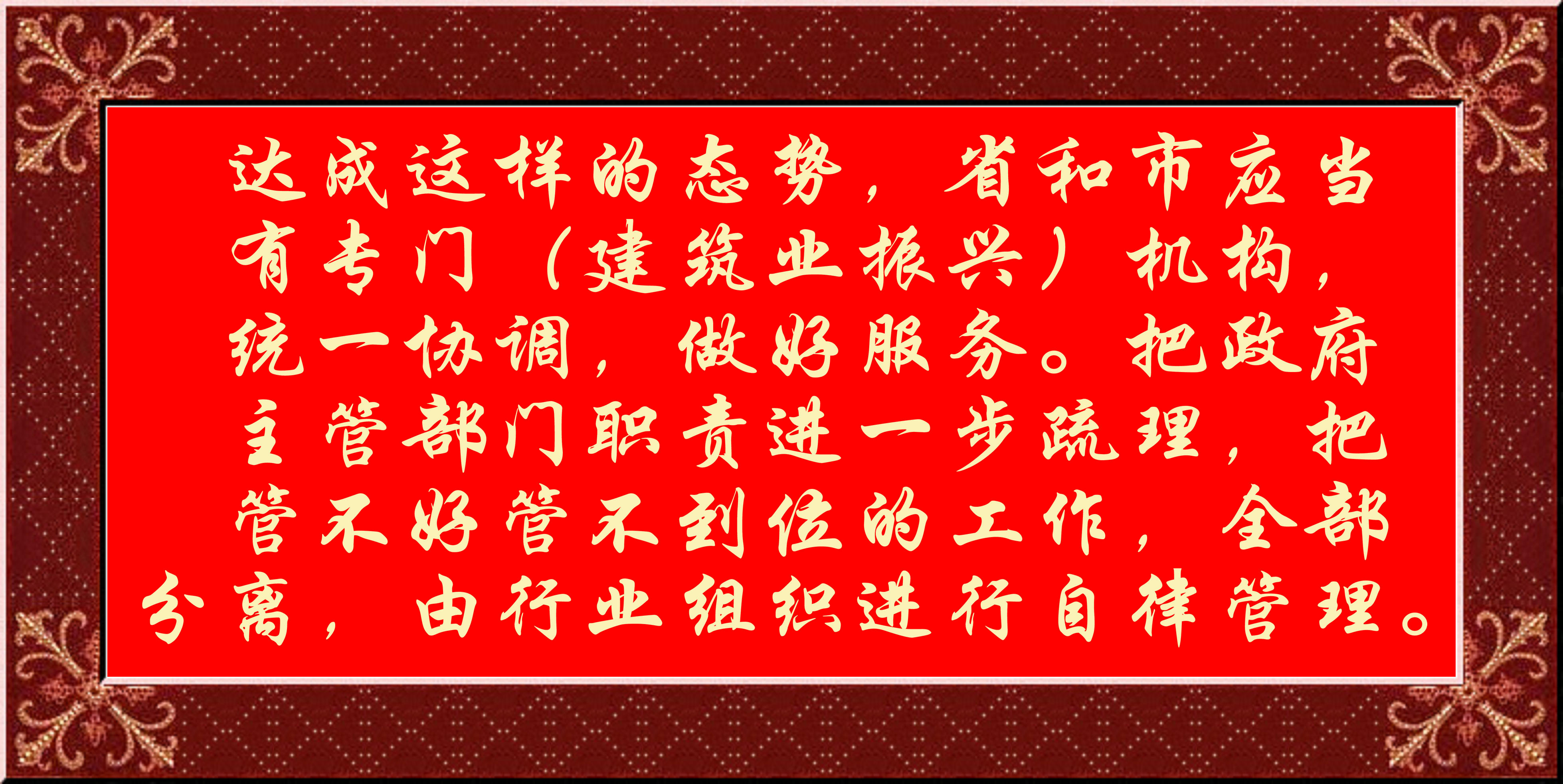 達成這樣的態(tài)勢,省和市應當有專門(建筑業(yè)振興)機構(gòu),統(tǒng)一協(xié)調(diào),做好服務。把政府主管部門職責進一步疏理,把管不好管不到位的工作,全部分離,由行業(yè)組織進行自律管理。