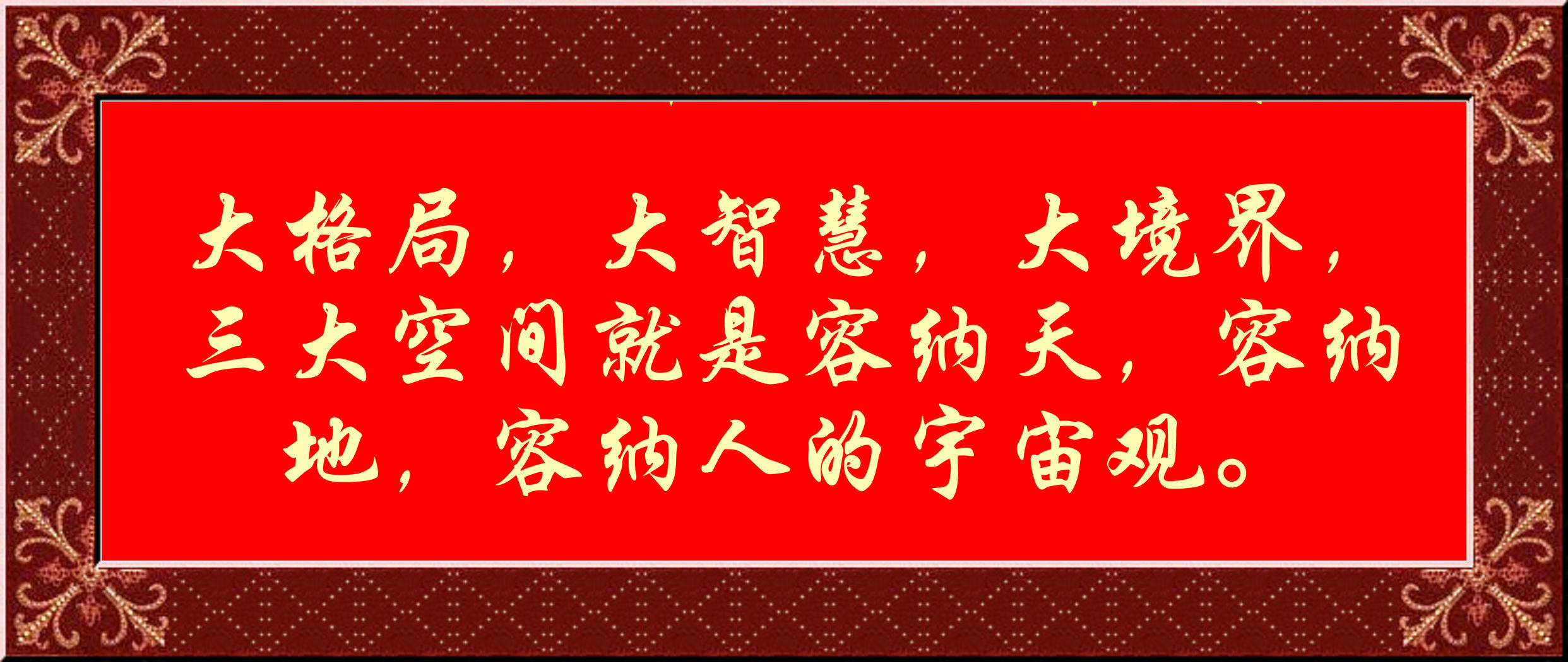 大格局,大智慧,大境界,三大空間就是容納天,容納地,容納人的宇宙觀。人類社會(huì)發(fā)展,從愚魅到理性,上萬(wàn)年發(fā)展到今天,可謂是登峰造極的神話,前無(wú)古人的奇跡,先知先覺的超越,預(yù)見未來(lái)的圣賢!