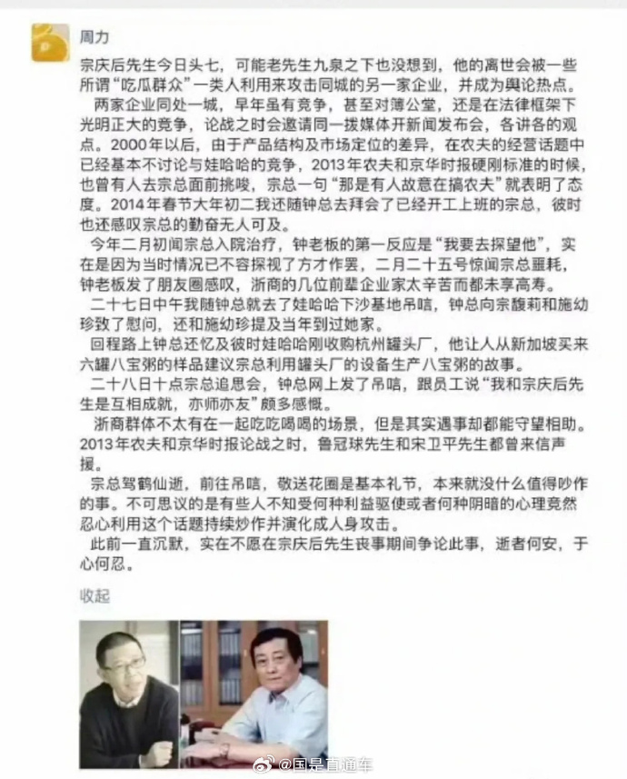 另據(jù)國是直通車3日報道,農(nóng)夫山泉副總周力博士朋友圈文,回應(yīng)“捧‘娃哈哈’踩‘農(nóng)夫山泉’風(fēng)波”。周力表示,宗慶后先生今日頭七,可能老先生九泉之下也沒想到,他的離世會被一些所謂“吃瓜群眾”一類人利用來攻擊同城的另一家企業(yè),并成為輿論熱點。兩家企業(yè)同處一城,早年雖有競爭,甚至對薄公堂,還是在法律框架下光明正大的競爭。