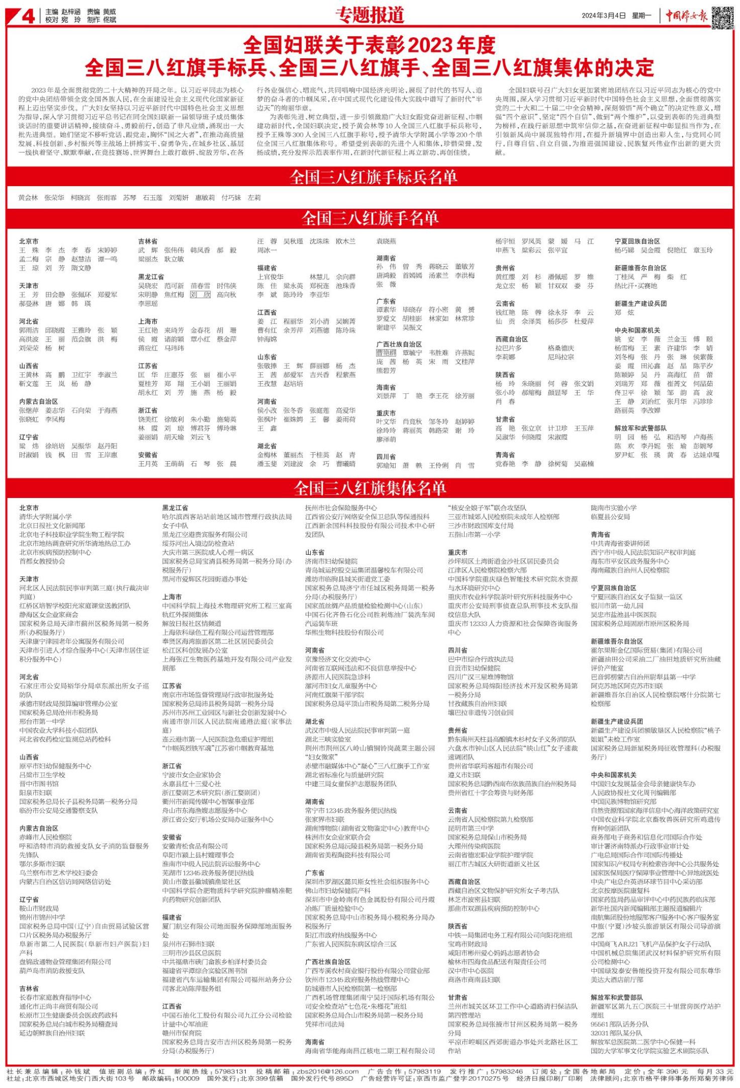 為表彰先進(jìn)、樹立典型,進(jìn)一步引領(lǐng)激勵(lì)廣大婦女跟黨奮進(jìn)新征程、巾幗建功新時(shí)代,全國婦聯(lián)決定,授予黃會林等10人全國三八紅旗手標(biāo)兵稱號,授予王殊等300人全國三八紅旗手稱號,授予清華大學(xué)附屬小學(xué)等200個(gè)單位全國三八紅旗集體稱號。希望受到表彰的先進(jìn)個(gè)人和集體,珍惜榮譽(yù)、發(fā)揚(yáng)成績,充分發(fā)揮示范表率作用,在新時(shí)代新征程上再立新功、再創(chuàng)佳績。