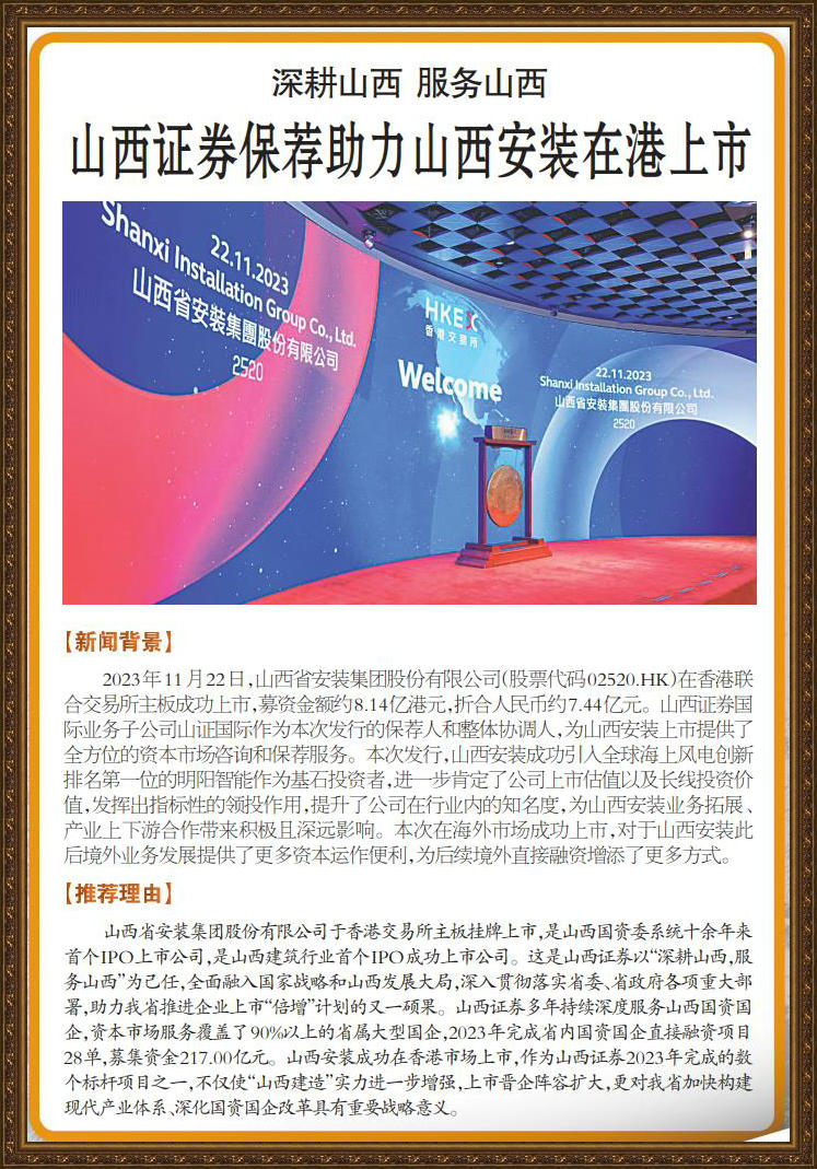 深耕山西 服務(wù)山西 山西證券保薦助力山西安裝在港上市