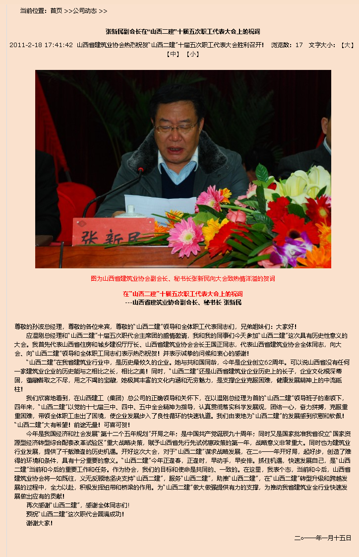 “山西二建”未來的發(fā)展,未來的前景強大!我可以告訴同志們:也是必然結果!我們今天參會的正式代表也罷,列席代表也罷,我在黨政聯(lián)席會議上,給領導同志們講的一點,個別領導同志們也講,我說經(jīng)過未來三到五年的奮斗,我們要達成這樣一個目標,給二公司裝上一雙翅膀,讓二公司或者“山西二建”想往哪飛,就往哪飛!想飛多高,就飛多高!想飛多遠,就飛多遠!這就是我們“十二五規(guī)劃”的目標!這就是我們“十二五”訴求的東西!而且我前天已經(jīng)講了,那個時候的到來,同樣是我們“山西二建”的必然結果!所以前兩天同樣給同志們講,2011年的職代會絕對非比尋常!2011年的職代會絕對不比前幾年的職代會!她對二公司未來幾年甚至更多年的預示非常!意義非常!必將會對未來幾年或更多年的實際成果,發(fā)展成果印證!今天我們所訴求的!今天我們規(guī)劃的!今天我們?yōu)橹冻龅臓奚模?