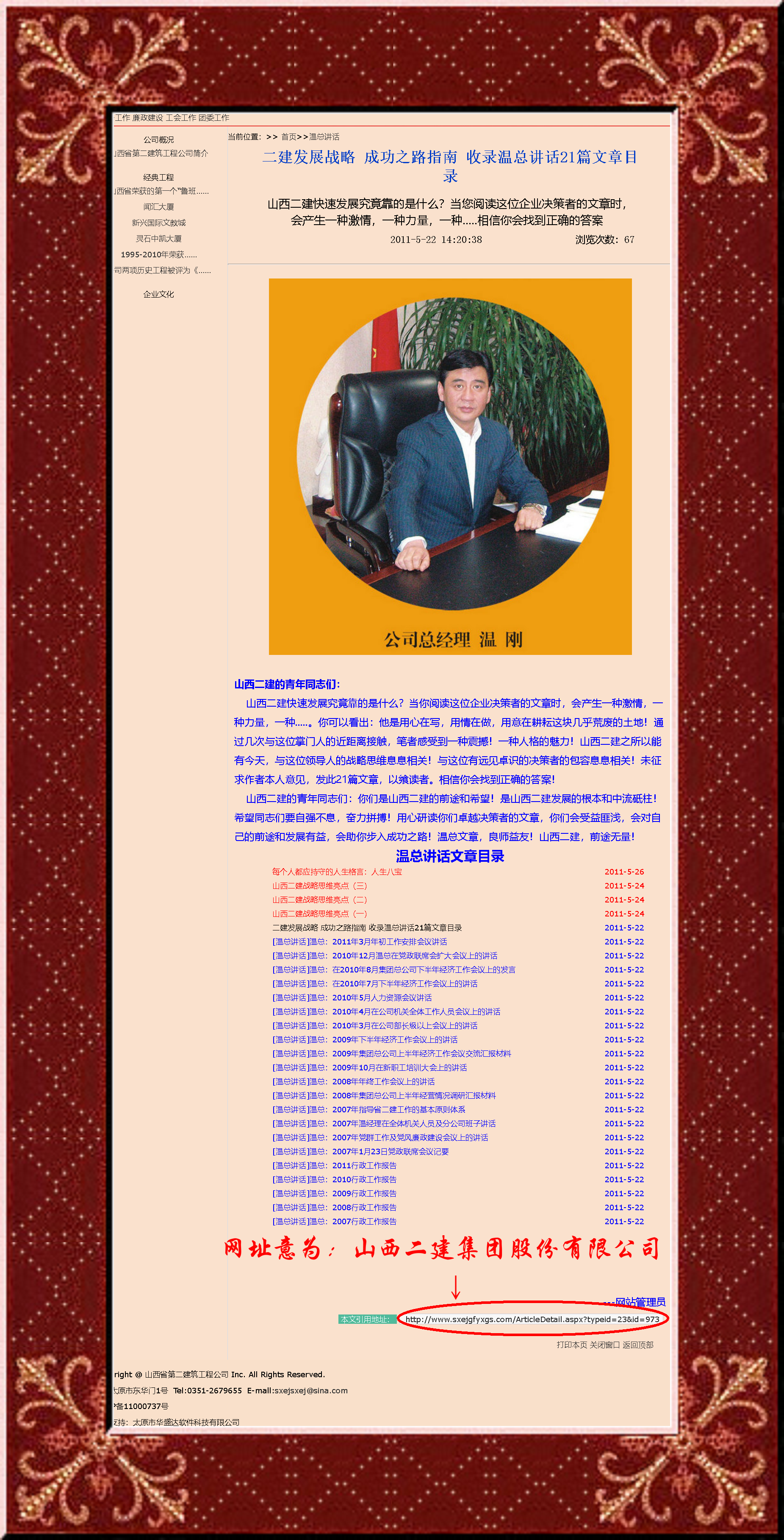 山西二建快速發(fā)展究竟靠的是什么?當你閱讀這位企業(yè)決策者的文章時,會產(chǎn)生一種激情,一種力量,一種.....。你可以看出:他是用心在寫,用情在做,用意在耕耘這塊幾乎荒廢的土地!通過幾次與這位掌門人的近距離接觸,筆者感受到一種震撼!一種人格的魅力!山西二建之所以能有今天,與這位領導人的戰(zhàn)略思維息息相關!與這位有遠見卓識的決策者的包容息息相關!未征求作者本人意見,發(fā)此21篇文章,以饗讀者。相信你會找到正確的答案!