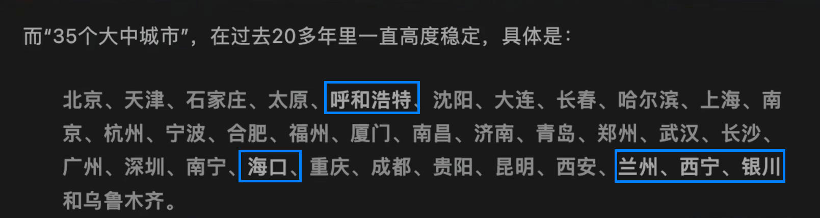 35個(gè)大中城市名單:北京、天津、上海、重慶、石家莊、太原、沈陽(yáng)、大連、長(zhǎng)春、哈爾濱、南京、無(wú)錫、常州、蘇州、杭州、寧波、合肥、福州、廈門、南昌、濟(jì)南、青島、鄭州、武漢、長(zhǎng)沙、廣州、深圳、佛山、東莞、南寧、成都、貴陽(yáng)、昆明、西安、烏魯木齊