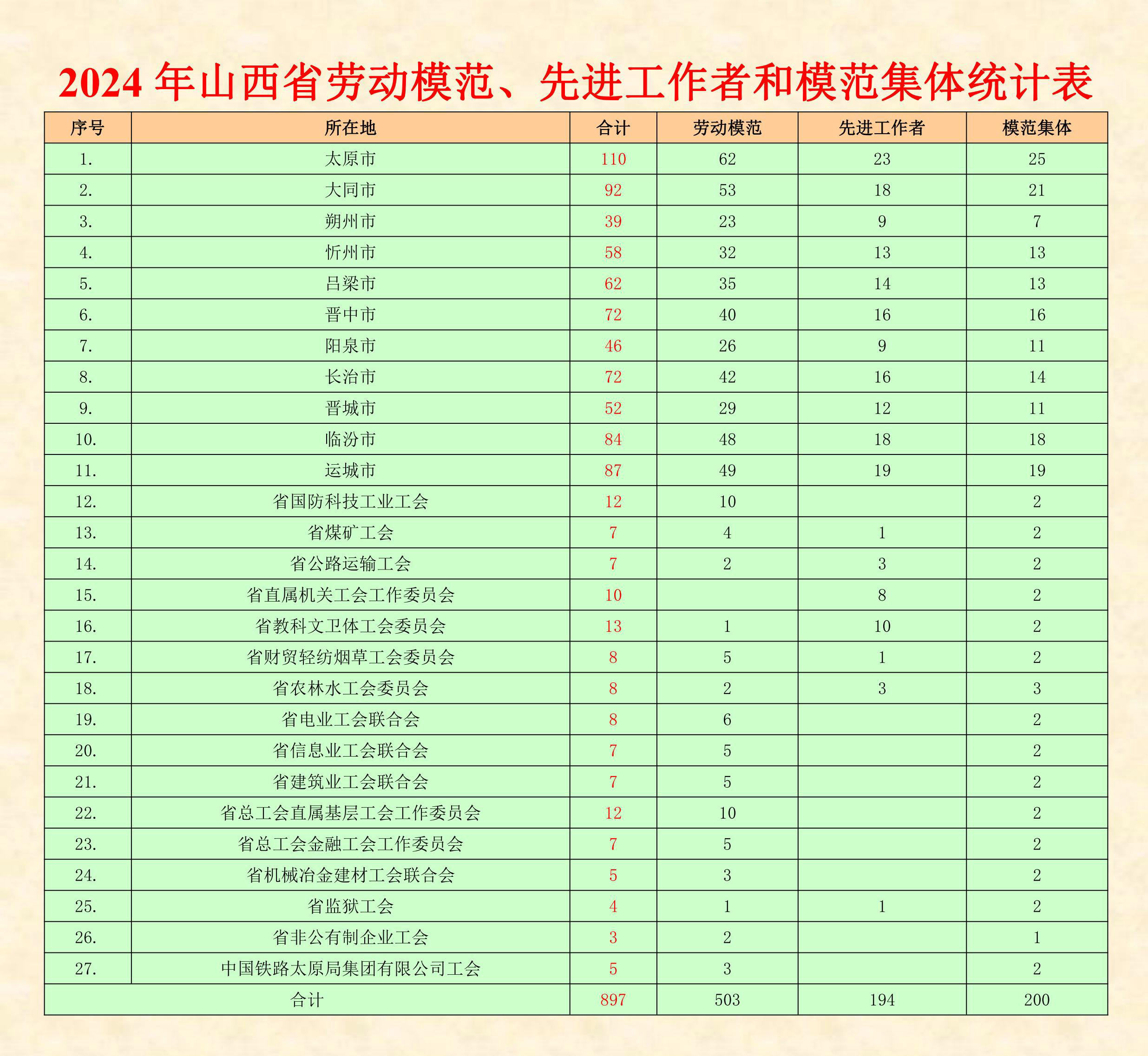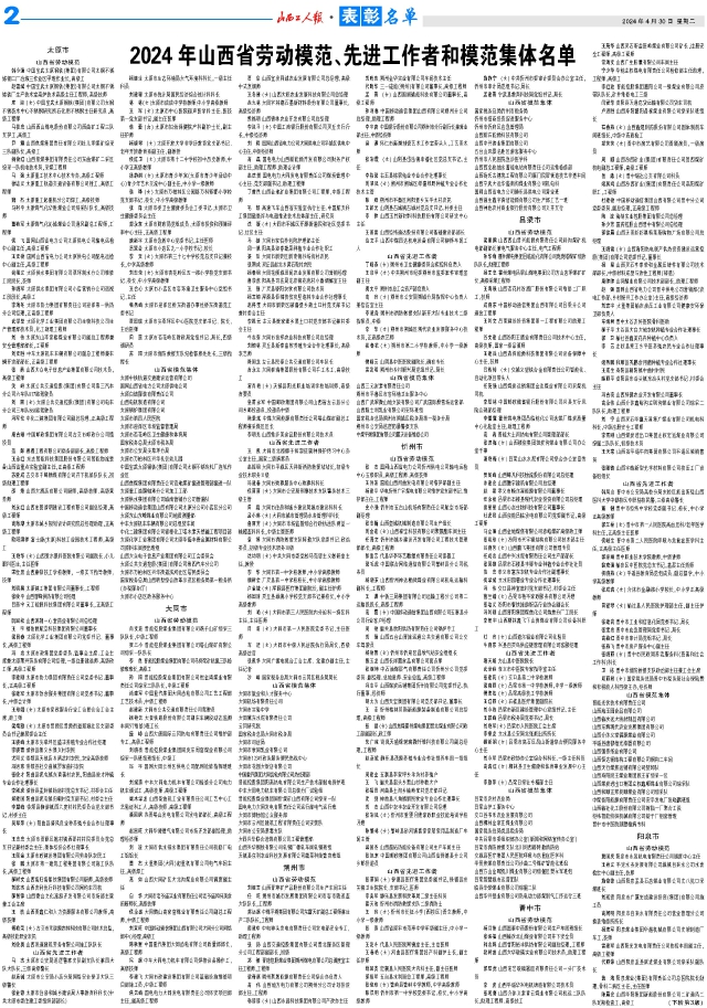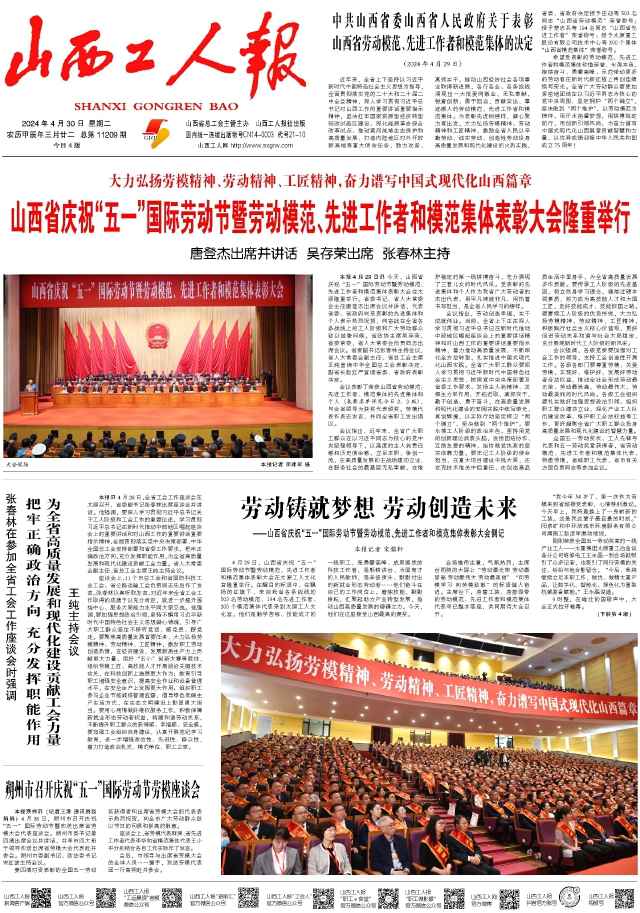 近年來,全省上下堅(jiān)持以習(xí)近平新時(shí)代中國特色社會(huì)主義思想為指導(dǎo),全面貫徹落實(shí)黨的二十大和二十屆二中全會(huì)精神,深入學(xué)習(xí)貫徹習(xí)近平總書記對(duì)山西工作的重要講話重要指示精神,堅(jiān)決扛牢國家資源型經(jīng)濟(jì)轉(zhuǎn)型綜改試驗(yàn)區(qū)建設(shè)、深化能源革命綜合改革試點(diǎn)、推動(dòng)黃河流域生態(tài)保護(hù)和高質(zhì)量發(fā)展、打造內(nèi)陸地區(qū)對(duì)外開放新高地等重大使命任務(wù),勠力攻堅(jiān)、真抓實(shí)干,推動(dòng)山西經(jīng)濟(jì)社會(huì)各項(xiàng)事業(yè)取得新進(jìn)展,各行各業(yè)、各條戰(zhàn)線涌現(xiàn)出一大批愛崗敬業(yè)、無私奉獻(xiàn),銳意創(chuàng)新、勇于擔(dān)當(dāng),貢獻(xiàn)突出、事跡感人的勞動(dòng)模范、先進(jìn)工作者和模范集體。為表彰先進(jìn)樹榜樣,凝心聚力再出發(fā),大力弘揚(yáng)勞模精神、勞動(dòng)精神和工匠精神,激勵(lì)全省人民以辛勤勞動(dòng)、誠實(shí)勞動(dòng)、創(chuàng)造性勞動(dòng)投身高質(zhì)量發(fā)展和現(xiàn)代化建設(shè)的火熱實(shí)踐,省委、省政府決定授予莊迎等503名同志“山西省勞動(dòng)模范”榮譽(yù)稱號(hào);授予楚志兵等194名同志“山西省先進(jìn)工作者”榮譽(yù)稱號(hào);授予太原重工股份有限公司技術(shù)中心等200個(gè)集體“山西省模范集體”榮譽(yù)稱號(hào)。