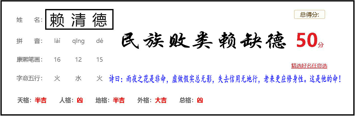 詩(shī)曰:雨夜之花是非命,虛做假實(shí)總無影,失去信用無地行,老來更應(yīng)修身性。這是他的命!