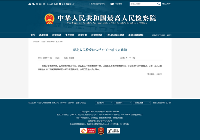 新華社北京7月2日電 記者2日從最高人民檢察院獲悉,黑龍江省委原常委,省政府原黨組副書記、副省長王一新涉嫌受賄一案,由國家監(jiān)察委員會調(diào)查終結(jié),移送檢察機關(guān)審查起訴。日前,最高人民檢察院依法以涉嫌受賄罪對王一新作出逮捕決定。該案正在進一步辦理中。